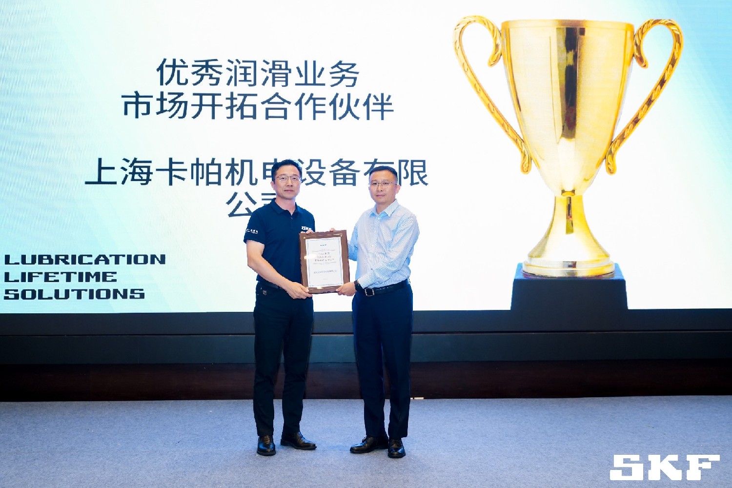 近日,全球轴承与润滑技术领导者斯凯孚(SKF)隆重举行了润滑合作伙伴会议。我司总经理范国华先生受邀出席,并代表公司从众多合作伙伴中脱颖而出,荣获“2025年度优秀润滑业务市场开拓合作伙伴奖”。该奖项是斯凯孚对我司在润滑业务市场卓越表现与突出贡献的高度认可。过去一年中,我司团队凭借敏锐的市场洞察